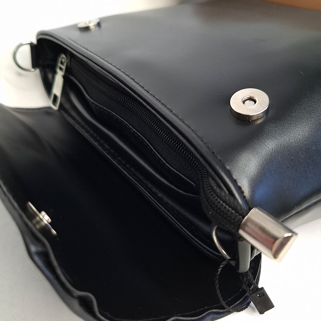 کیف پاسپورتی ایستاده کوچک و جمع و جور اما جادار. قابل استفاده به صورت دوشی. تک رنگ مشکی و دارای سه زیپ